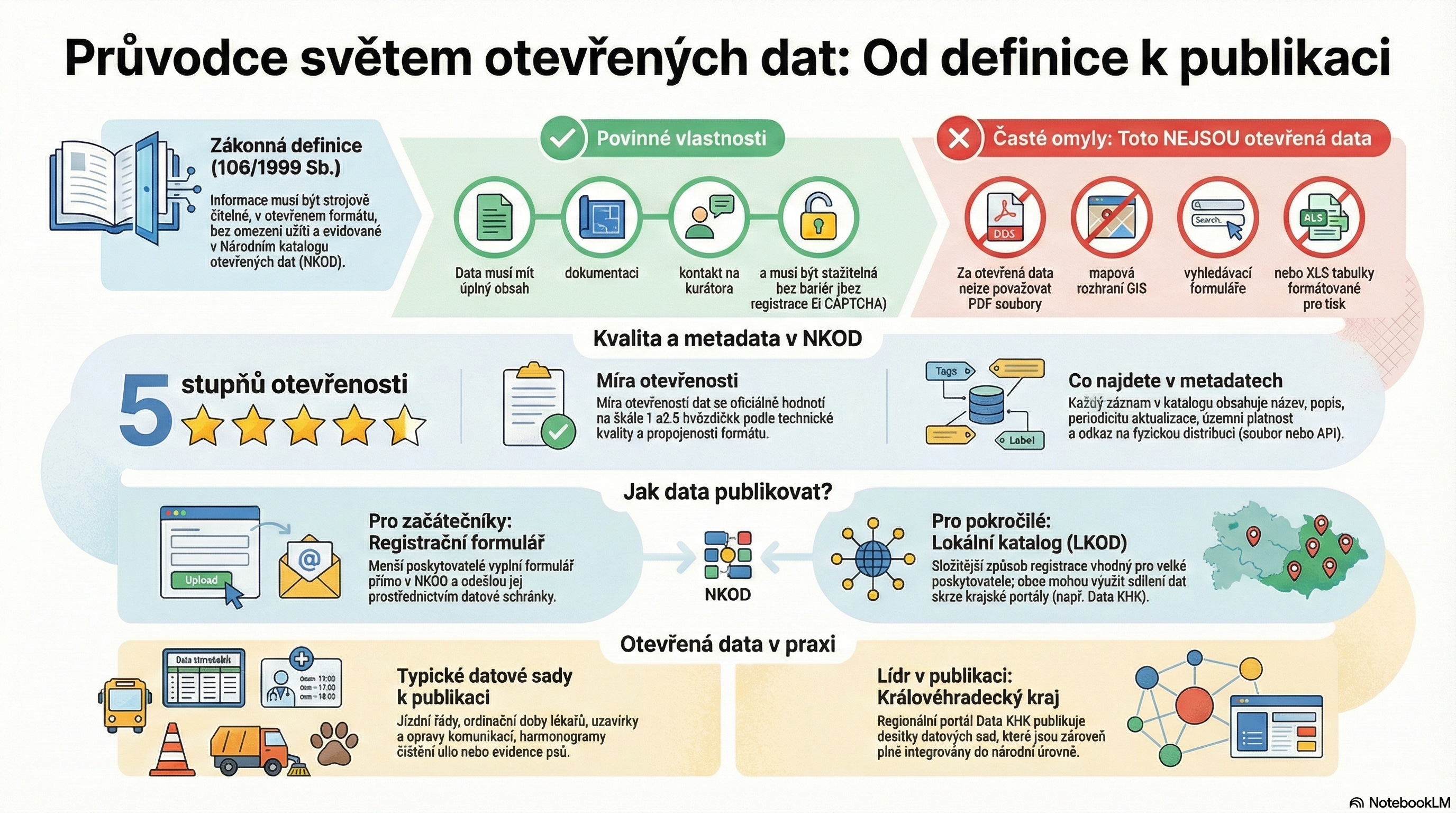 Oficiálně lze tedy za otevřená data v ČR považovat pouze ta data, která jsou registrovaná v Národním katalogu otevřených dat (NKOD). Pokud nevíme, kde data hledat, je ideální pro začátek zkusit právě NKOD, který obsahuje přes 50 poskytovatelů z řad ministerstev či dalších orgánů veřejné správy. Přes uživatelské rozhraní katalogu lze vyhledávat datové sady jednak pomocí textového hledání v jejich názvech a popisech, ale také podle názvu poskytovatele, klíčových slov, témat datových sad a formátu datových souborů. Po nalezení hledané datové sady je zobrazen její detailní záznam, tzv. metadata. Ten obsahuje název, popis, klíčová slova a témata, kterými je datová sada popsaná, dále pak periodicitu aktualizace datové sady, informace o tom, jakého časového úseku, případně území se datová sada týká, a pak také odkaz na dokumentaci datové sady. V dokumentaci se nachází veškeré informace k vybrané datové sadě, včetně informací o tom, jak data nejlépe zpracovávat, nebo na co si naopak dát při jejich zpracování pozor. Ve spodní části záznamu o datové sadě jsou pak uvedeny její distribuce. Distribuce datové sady představují její fyzickou podobu ve formě souborů ke stažení nebo datové služby (API). Jedna datová sada může být k dispozici ve formě více distribucí, které se od sebe liší v případě souboru ke stažení datovým formátem, nebo se jedná o datovou službu. Každá distribuce pak má specifikovány své podmínky užití, datový formát a, pokud je k dispozici, strojově čitelné schéma souboru ke stažení či specifikaci datové služby.