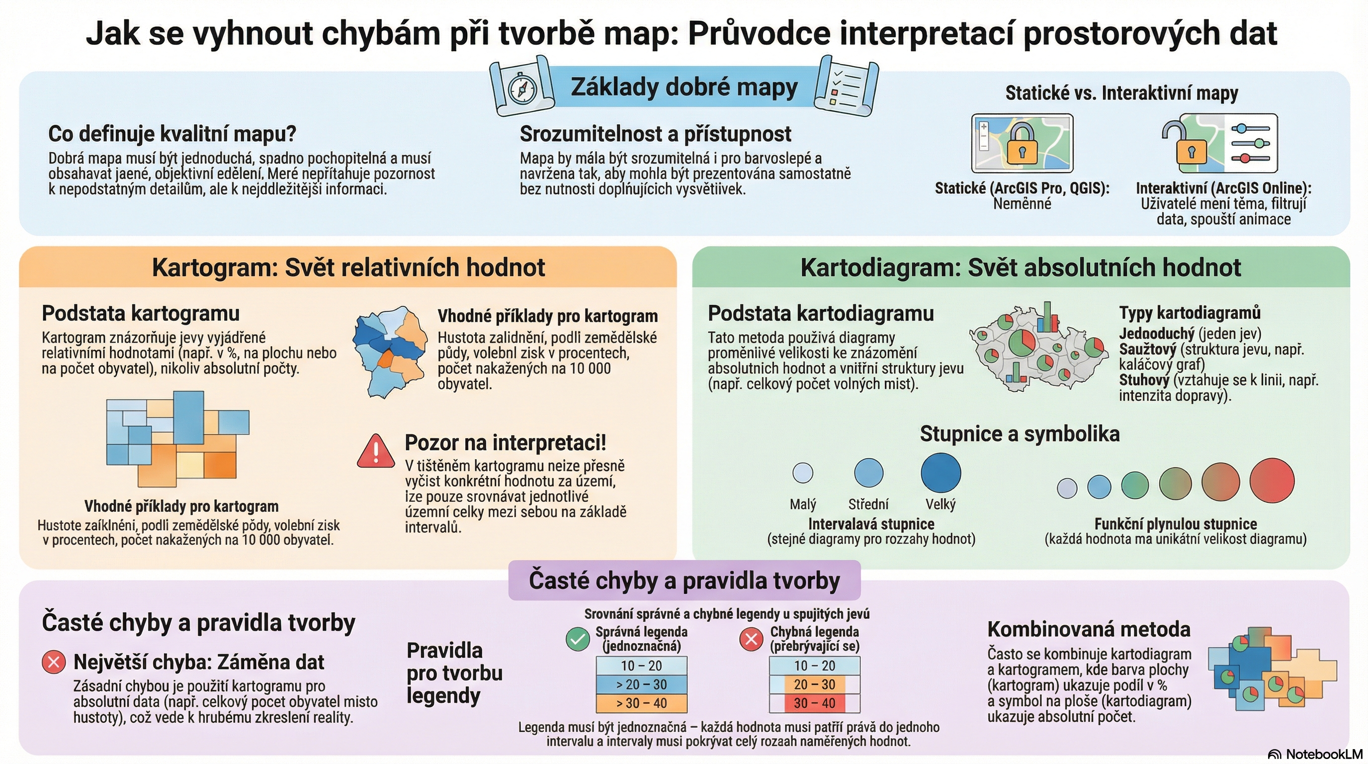 Mapy jsou nejúčinnějším nástrojem pro vizualizaci prostorových vztahů. Mohou lidem usnadnit vnímání rozložení výskytu jevů, které nemusí být na první pohled patrné z tabulek a grafů. Mapy nemá smysl vytvářet, pokud data nemají žádné zeměpisné členění (umístění do prostoru) nebo v datech nejsou žádné významnější rozdíly. I kartografie, tedy věda zabývající se tvorbou a zpracováním map, má svá pevná pravidla, která je potřeba dodržovat.